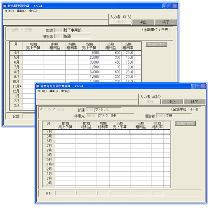 LINEPROは「担当別予算」と「担当得意先別予算」を登録可能で、実際の売上実績を対比させてその進捗を管理することが可能です。