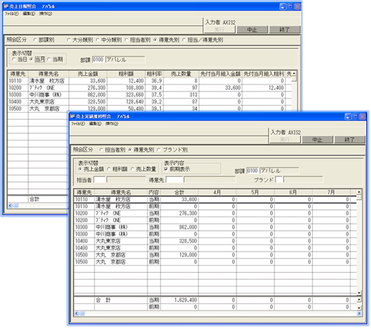 日々、発生する売上実績を、担当別・得意先別など様々な切り口でリアルタイムで照会することが可能です。