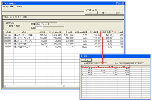 商品別の「売上・仕入・在庫」といった基本情報の数量、金額データを照会できます。