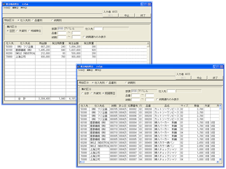 計画入力の結果を受け、メーカーへの発注入力を行います。サイズ、カラーのマトリックス入力や外貨単価入力が可能です。